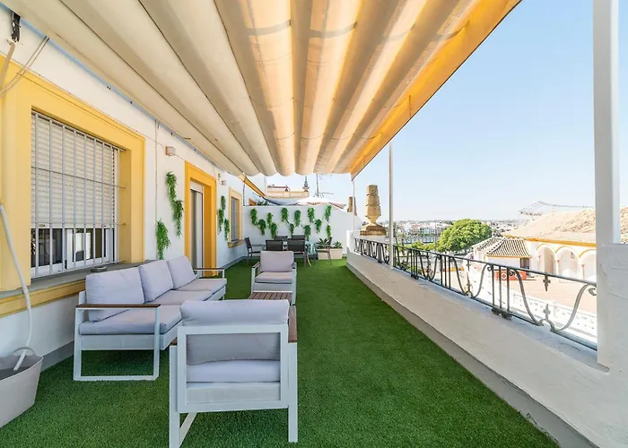 The spacious Trendy Penthouse By The Bullring Apartment Seville is situated in Seville, 14 minutes' walk from the Triana neighborhood, and offers spa amenities such as a solarium. Featuring a terrace with views of the city, the apartment is just around the corner from the Historic iron Puente de Isabel II Arch Bridge.